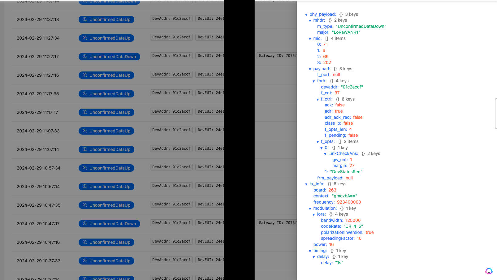 As shown in the screenshot, the sensor’s data interval is set at 10 minutes, while the expected uplink interval in the Device profile is 30 secs, Device-status request frequency is 30. The RSSI and SNR values for the sensor are excellent, and the ADR status is true.