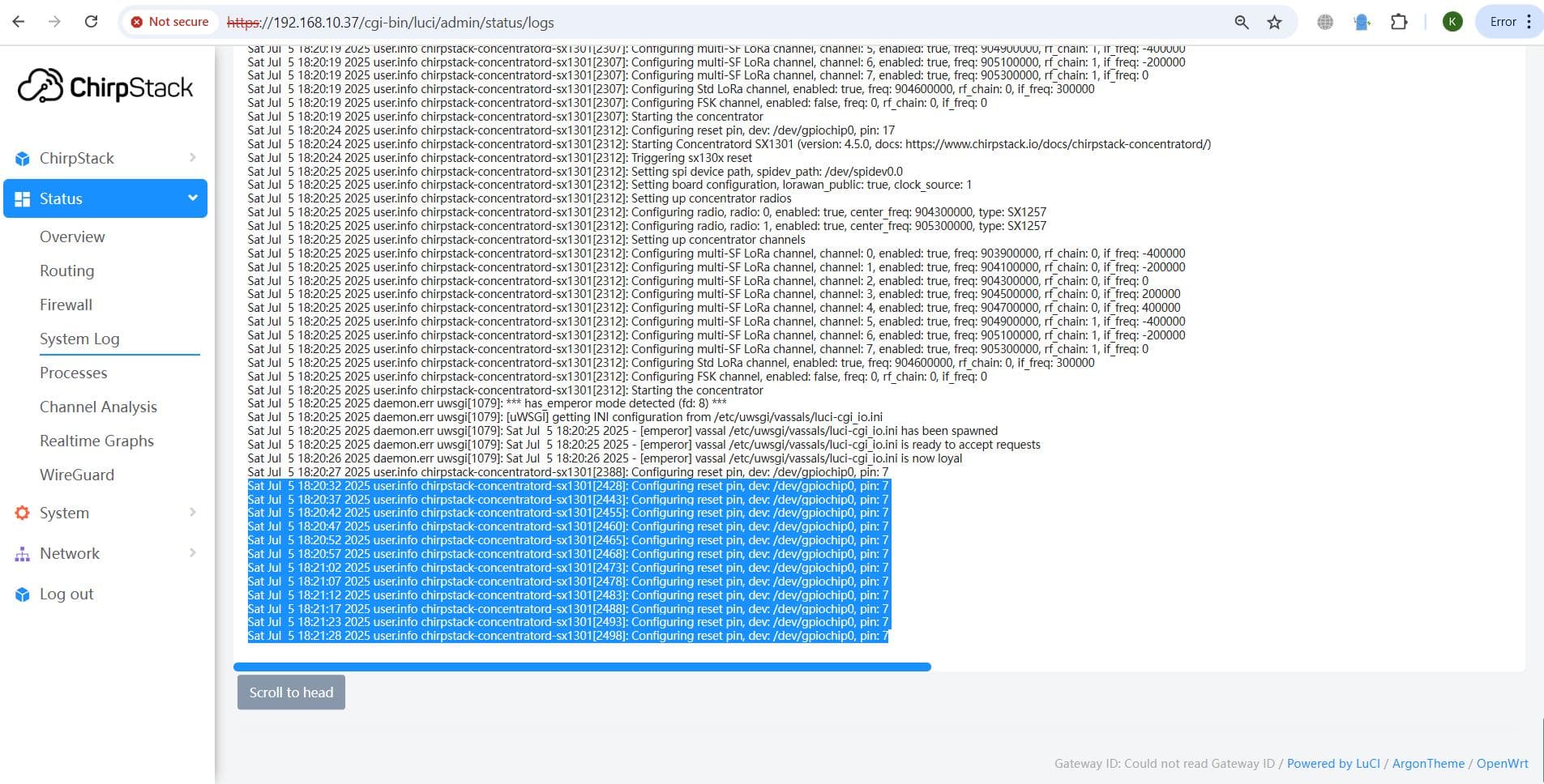 However, it loops at the error “user.info chirpstack-concentratord-sx1301[2443]: Configuring reset pin, dev: /dev/gpiochip0, pin: 7”